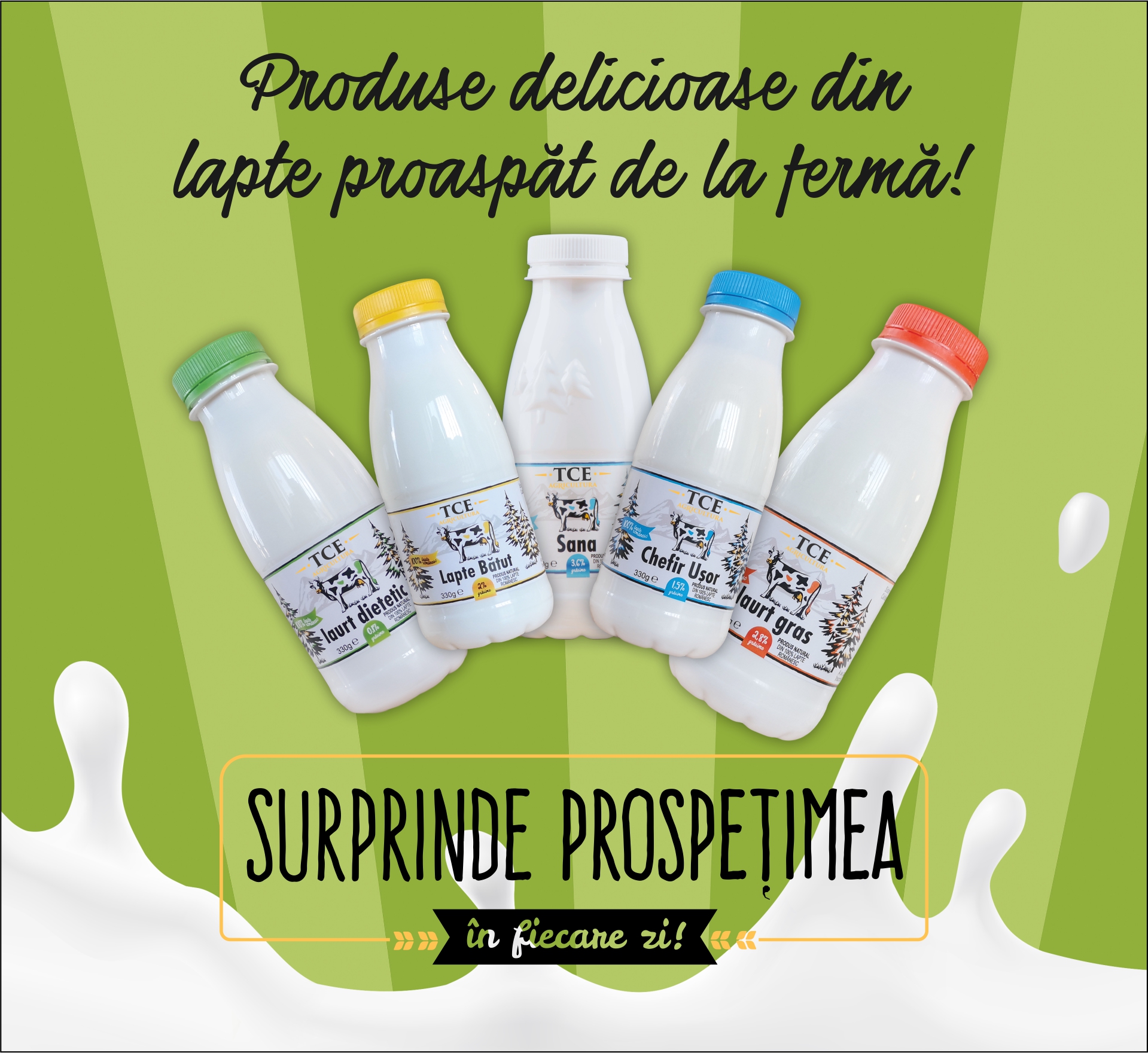 Laptele obținut din fermele proprii este procesat în fabrica de lapte, unde sunt produse lactate realizate din lapte de vacă, respectând rețete simple și curate. Lactatele TCE AGRICULTURA sunt rezultatul unui lanț scurt de producție, în care laptele ajunge rapid de la fermă la procesare.
